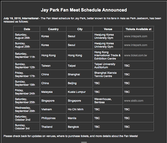 Fan meet schedule will be posted on Jay Park’s official website www.jaypark.com/fanmeet.html and full details of each stop will be announced on the site by around the middle of July.