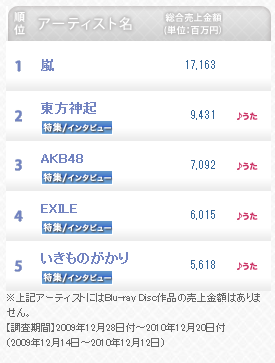 ※Aggregation period: Artist total sales (14 December 2009 ~ 12 December 2010), Manufacturer total sales (28 December 2009 ~ 26 December 2010)