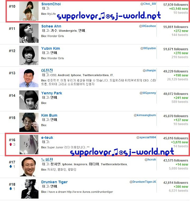 The list above tells it all,Kim Yuna topped the list,however Dong Hae of Super Junior emerged as the person with the most followers on twitter among k pop celebrities,most of the members of Super Junior and Wonder Girls are on the list!