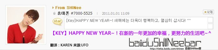 [Info] SHINee Key wishes everyone a "Happy New Year"! Info★Vannie^.-vJan 01, 2011 Share 0 comments A new year has arrived!Check out what Key has to said in their official UFO message to the fans!Key: Happy new year~! in this new year let’s be more happy , work hard and live meaningfully! ^^cr: ufo, baidu Tags: Info, Key, Shinee Share Previous articleNext article Leave a comment Name Email Content Post comment