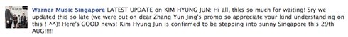Warner Music Singapore: LATEST UPDATE on KIM HYUNG JUN: Hi all, thks so much for waiting! Sry we updated this so late (we were out on dear Zhang Yun Jing's promo so appreciate your kind understanding on this ! ^^)! Here's GOOD news! Kim Hyung Jun is confirmed to be stepping into sunny Singapore this 29th AUG!!!!!