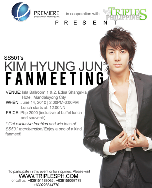 [info] SS501 Kim Hyung Joon will have a fanmeeting in Philippines on 6/14 Kim Hyung JoongellieJun 02, 2010 Share 0 comments All needed details posted already, if you are interested to meet SS501's baby, go to the main thread of TSPH forum, click HERE.Credit: triplesph.com Tags: Kim hyung joon, Ss501 Share Previous articleNext article Leave a comment Name Email Content Post comment