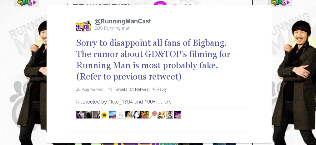 Due to some leaked photos of GD&TOP, it was a hot issue in the internet that they are filming for SBS 'Running Man'. But this was denied by the staff and cast of the said program. They posted on twitter, "Sorry to disappoint all fans of Bigbang. The rumor about GD&TOP's filming for Running Man is most probably fake."