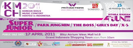 Indonesian promoter, W Productions will bring Super Junior, Girl's Day, Park Jungmin, The Boss and X-5 to Indonesia for performing at "Korean Idols Music Concert Hosted in Indonesia" (KIMCHI). KIMCHI 2011 , will be held on Istora Senayan Saturday, June 4 · 6:00pm – 8:00pm
