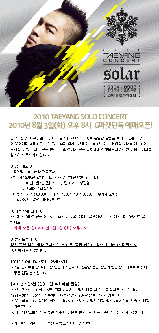Due to the content for Taeyang’s concerts, the age limit rule was added so the below information must be read. We hope you read it.
