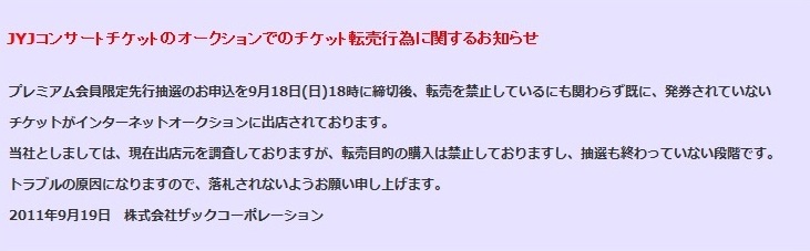 We have closed the premium members' application for "2011 JYJ UNFORGETTABLE LIVE CONCERT IN JAPAN" as of Sept 18 (Sun) 18:00. Afterwards, though we are prohibiting the resales of the tickets, the tickets (that are not issued yet) are already in some of the internet auction sites.