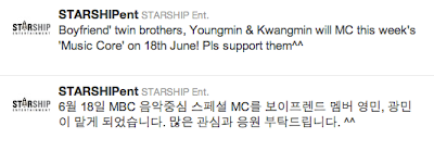 [INFO] The twins of Boyfriend to be MCs on this week's MuCore boyfriendtheaJun 15, 2011 Share 0 comments STARSHIP Entertainment has been so kind to let us know that the twins from rookie group Boyfriend, Youngmin & Kwangmin, will be MC-ing this week's Music Core on 18th June.Let's show them our support! :)Source: @STARSHIPent Tags: Boyfriend, Music core Share Previous articleNext article Leave a comment Name Email Content Post comment