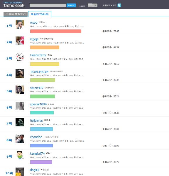 Trend Seek, a Twitter Ranking in Korea posted the top 100 most searched twitter accounts in Korea. Mostly, idols dominated the ranking. The most searched twitter account belonged to famous Korean novelist Lee Oisoo (@oisoo) who currently has 781,147 followers at the moment.