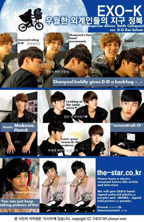 The power that maintains EXO-K must be their super powers and brotherly love. Between the photoshoots, they smoothed out each other’s clothes and monitored each other, showing that they are one. Also, there are not only the EXO-K members, but also EXO-M members in China whom they show much longing for. EXO-K is a rookie group that is still unfamiliar with the camera and makes mistakes on stage. However, just like their battle cry, “WE ARE ONE,” with their brotherly love, they carefully point out that they will “be a group that lasts for a long time,” as they said on their showcase.