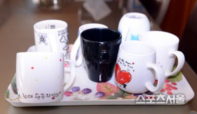 The individually-designed cups given by the fans. There are writings to cheer on Super Junior and pictures engraved on them.