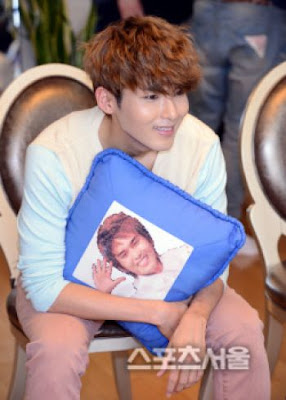 Ryeowook talking about his dorm life while hugging a cushion bearing his own photo, which was given by a fan.