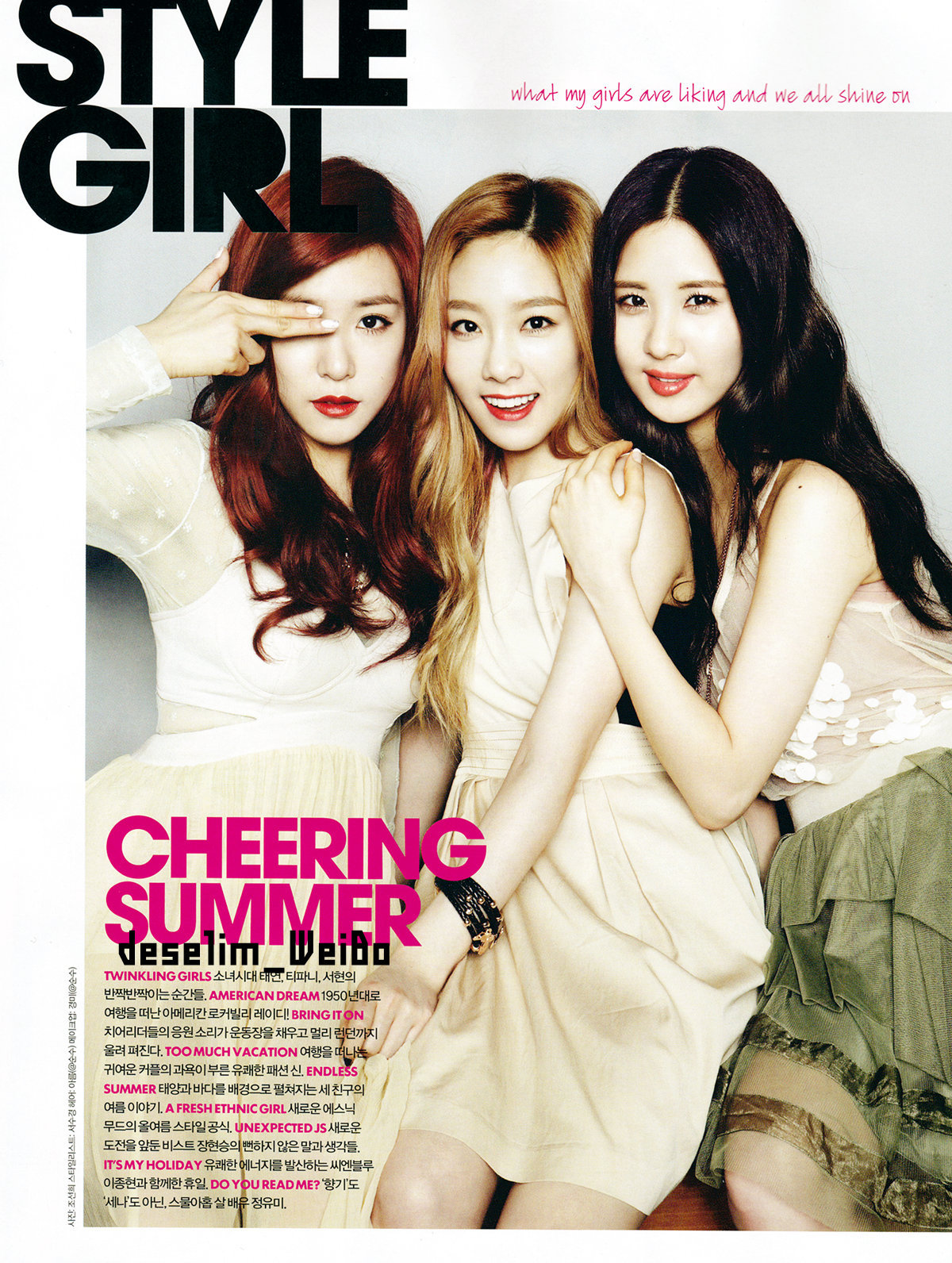 The July issue of “Elle Girl” magazine featured a cover photo, photoshoot, and interviews with Taeyeon, Tiffany, and Seohyun. The piece began with a brief introduction.