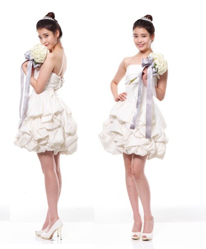 IU is seen posing in white mini wedding dress in the latest set of photos. 11st stated,"March and April are wedding season, we reveal the posters to promote our products".