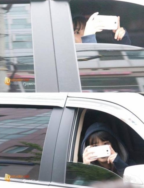 Recently, several photos of IU were posted on an online community board with the title, ‘IU filming her fans after giving them presents’. In the photo, the singer could be seen in her vehicle taking pictures with her smartphone out the window.