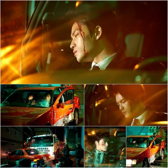 In the photos, Jaejoong gets involved in a mysterious car accident while carrying out a mission. He is seen unconscious and bleeding in a destroyed car.