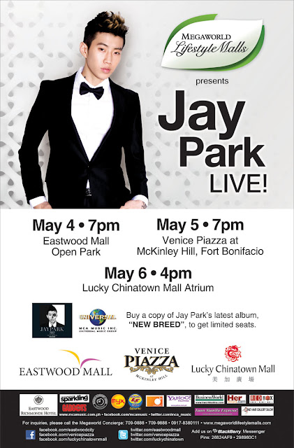Jay Park is performing live on May 4 (7PM) at Eastwood City in Quezon City, on May 5 (7PM) at Venice Piazza at McKinley Hill in Fort Bonifacio, and on May 6 (4PM) at Lucky Chinatown Mall in Binondo, Manila. Buy a copy of his album at the concert venues on the day of the event and get a chance to have Jay Park sign your CD!