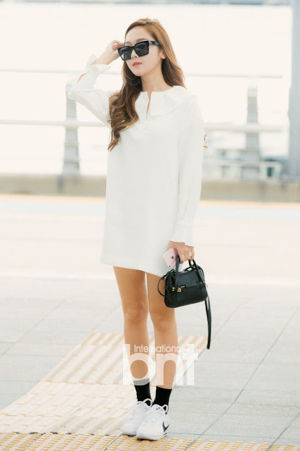 Jessica is spotted at Incheon Airport today departing for Hong Kong for a schedule. Jessica is looking neat yet stylish in her one piece all white dress and matches it up with a pair of white sneakers. The black socks, bag and sunglasses definitely complete her look. She looks adorable and chic in her get up.