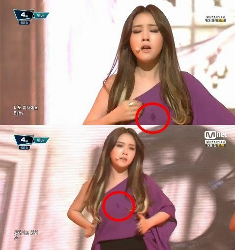 The photo that was screen captured shows Minah performing her song on M!Countdown. However, the journalist targets and even circles the unnecessary mark spotted on her costume. The article also gives examples of netizens' questions stating "Did Minah spill water?" and also "Did she spray perfume before her stage?".