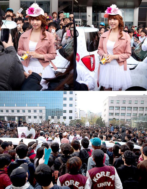 Approximately three hours later, Juniel appeared at Korea University campus in Anam-dong, Seoul, and she was immediately surrounded by 3,000 people who have been waiting for her. A great number of students ran out to the main square, leaving the all libraries almost empty.
