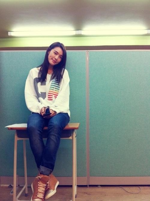 In the photo, Kahi is wearing comfortable white shirt and a pair of jeans, showing off a casual look. Sitting on a desk, she looks pretty even with minimal makeup and gives a sweet smile for the camera.