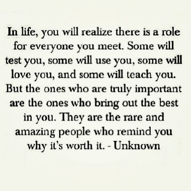 "In life, you will realize there is a role for everyone you meet. Some will test you, some will use you, some will love you, and some will teach you. But the ones who are truly important are the ones who bring out the best in you. They are the rare and amazing people who remind you why it's worth it. -Unknown."