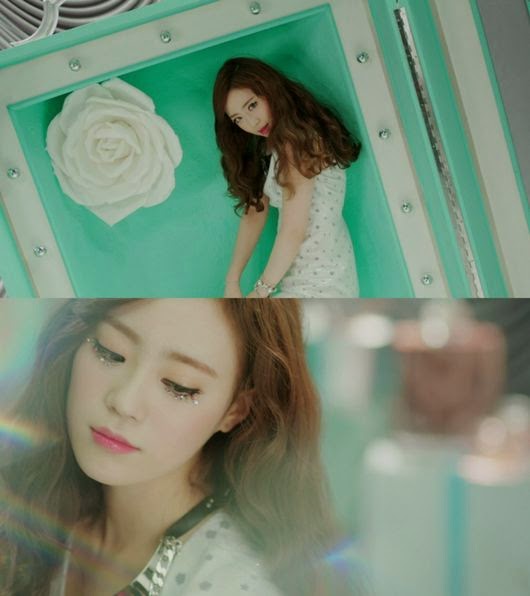 In the video, Youngji is seen dancing in a giant perfume box with gift boxes surrounding around her. The pastel mint color and sparkling make-up help emphasize on Youngji's cute and innocent charm.
