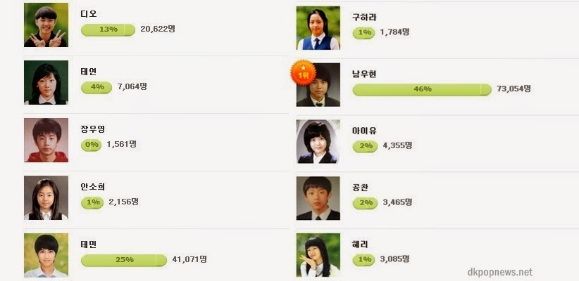 Kids from Daum.net were asked to select the idol with the best graduation photo among the 10 idols. Idols included in the poll are D.O.,Taeyeon, Jang Woo Young, Ahn Soo Hee, Taemin, Goo Hara, Woohyun, IU, Gongchan and Hyeri.