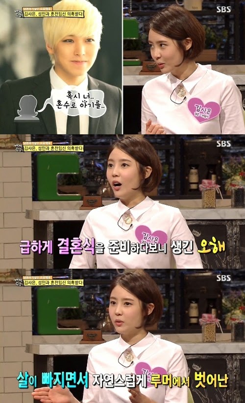 Kim Sa Eun talked about the rumor of her pregnancy with Sungmin before marriage. She said, “As we announced the news about wedding so sudden, people asked me if I was pregnant before getting married. They made jokes if I gave him the baby as a present. But in fact, I’m not pregnant back then or now. They realized it as I got thinner with the preparation.”