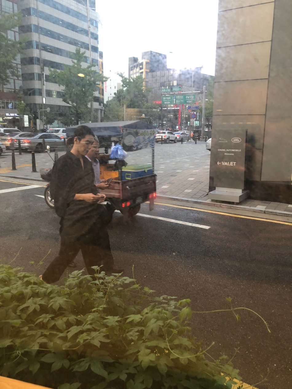 A netizen spotted Woo-bin on the street and took some photos of him. He wore black clothes which make him look even thinner and he tied his hair up in a ponytail.