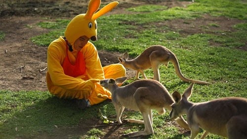 On the photo, Kim Woobin wore a yellow kangaroo costume. He was feeding the joeys (baby kangaroo). That photo was shot in Australia for SBS' 'Running Man' where he guested.