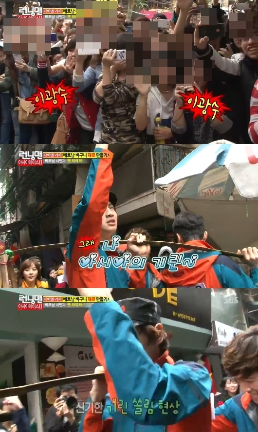 At a location, Kwang Soo appeared in the shoutings and cheerings from the crowd. When Jong Kook asked fans to shout his name, they shouted it a bit shyly, then the crowd kept shouting 'Lee Kwang Soo' endlessly making him so touched.