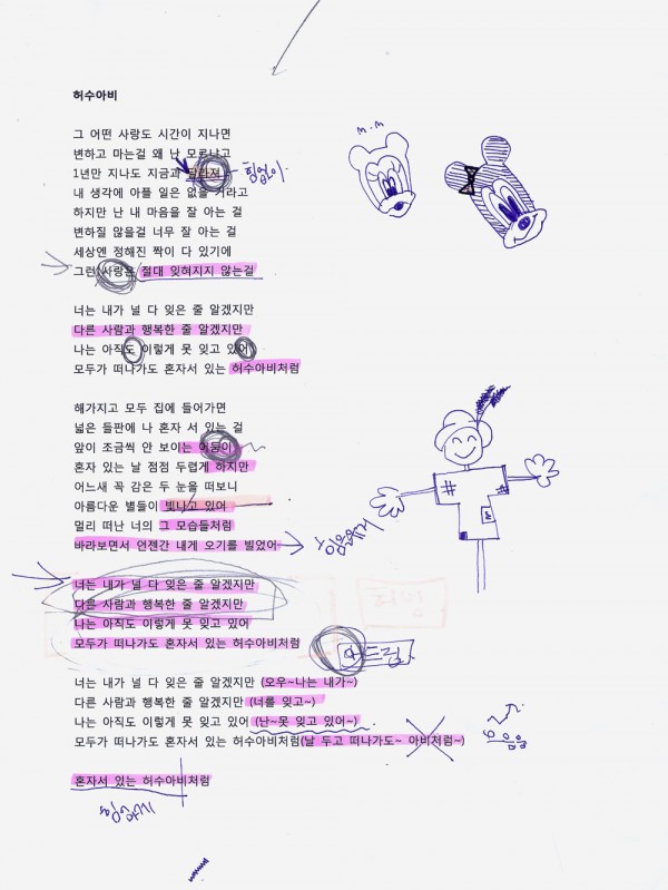 On November 22, YG Entertainment’s official blog, YG-Life has revealed the lyric notes of “Scarecrow”. The note included corrections, various highlights and some doodles by Lee Hi himself.