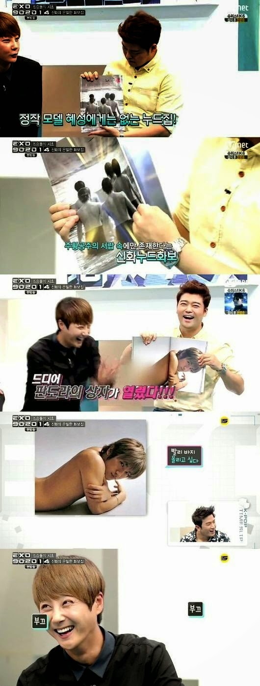 In the broadcast of Mnet's 'EXO 90:2014' on August 29th, MC Jun Hyun Moo brought out the infamous nude photobook of Shinhwa which shocked the EXO members at its unprecedented extent.