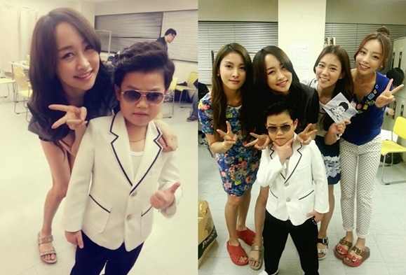 ‘Little Psy’ Hwang Min Woo snapped a friendly photo with girl group KARA.