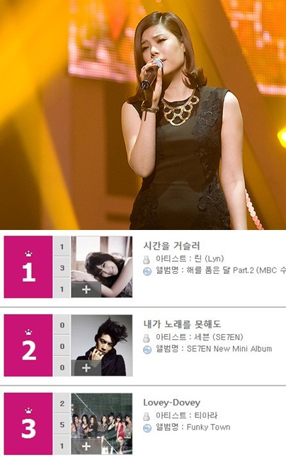 Meanwhile, following Lyn is Se7en with his comeback track "When I Can't Sing" on #2 and T-ara's "Lovey Dovey" on the third spot. Other new entry in the top 10 include Brown Eyed Girls Miryo's "Dirty" and B2ST Junhyung's "Living Without You".
