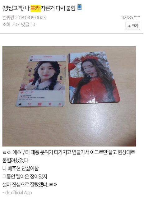 We have reported earlier this week that a male fan cut Irene's photocard into pieces to show disappointment with Irene's action.