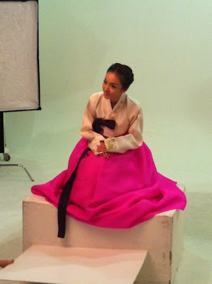 In the photo, Dara is wearing an elegant pink hanbok. She is posing gracefully but a bit awkward while having her ad shooting.