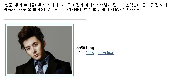 [형준] 우리 트리플!! 우리 기다리느라 목 빠진거 아니지??^^ 빨리 만나고 싶었는데 좀더 멋진 노래만들라구해서 쫌 늦어졌네? 우리 기다린만큼 이번 앨범도 많이 사랑해주기~~~^^