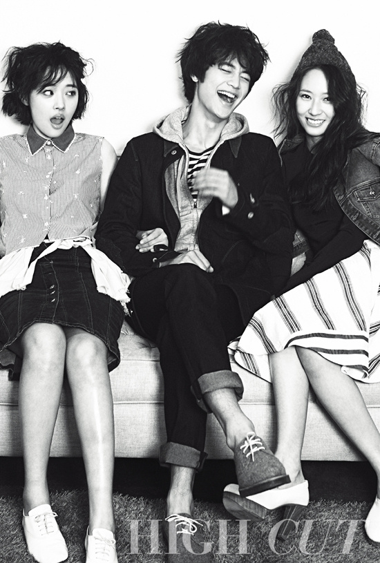 Inside the studio flowing with chilly winter air, it seemed like a protective shield of spring was made around just these three people. Could biological siblings even be this friendly? The stars of the 94th issue are SHINee's Minho and f(x)'s Sulli and Krystal who were chosen as the "flower beauty" of idols. The question of “Will they actually be friendly in real life?" was answered as soon as Minho arrived at the shooting site. "Is it there?" He asked where the girls' make-up room was. He strode there and opened the door without hesitation. When Minho greeted hi, friendly 5-octave voices replied. While the shooting was held, they talked whenever they could and burst into laughter even when they just met eyes. The photographer said, "It'll be good if you look even closer" during the shoot so they immediately put their heads together and linked arms. As soon as Minho and Sulli's hands were laid on top of each other, Sulli playfully said, "Ah, our hands touched!" The 20 year olds Sulli and Krystal are known to be best friends and it seems like a happy virus surged out just because they're with each other. Even the people around who were watching them followed suit and became happier. The fresh youth and the refreshing time we spent with them.
