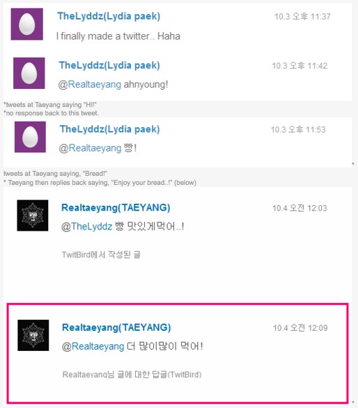 [MISC] Taeyang's Twitter Updates + Replies Big BangJannicaOct 04, 2011 Share 0 comments Taeyang wanted to tweet Lydia saying, “Eat lots and lots of bread!” but ended up tweeting that to himself.Credits: swaggalevel-1000C:BIGBANGUPDATES Tags: Big bang, Misc, Taeyang, Twitter Share Previous articleNext article Leave a comment Name Email Content Post comment