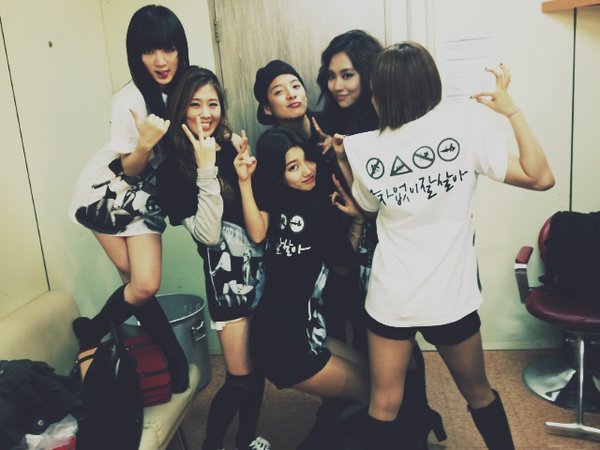 miss A's members and Amber are seen wearing black and white t-shirts,the title of miss A's new song "Can Live Well Without Man (I Don't Need A Man)" is printed at the back of their t-shirts.