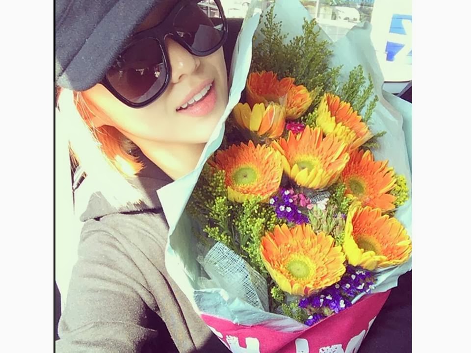 On the photo, she's wearing cap and sunglasses and holding a bouquet of beautiful flowers. She wrote, "Thank you for the warm welcoming hk! <3"