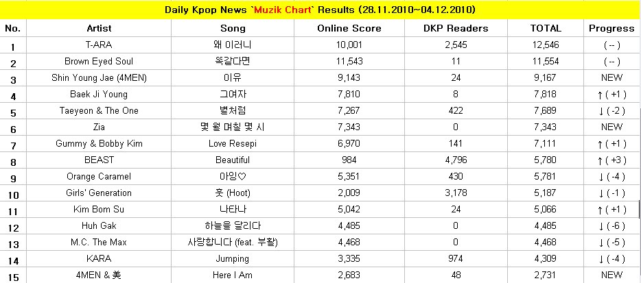 T-ARA once again snapped the first place this week with their song "Why are you like this". Despite having the second highest online score, T-ARA managed to be #1 with the help of poll score. BEAST has the most votes this week but not enough to reach the top. Check out the full result below!