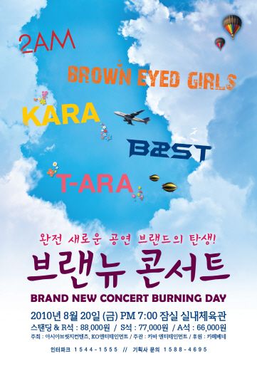 Asia Bridge Contents announced in a press release that K-pop groups 2AM, Brown Eyed Girls, BEAST, Kara and T-ara will take to the stage of the "Brand New Concert - Burning Day!!" to be held at the Olympic Park Stadium in Seoul on August 20.
