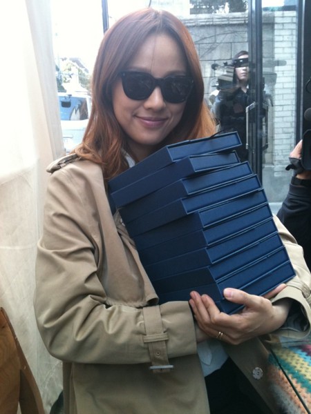 On March 21, Lee Hyori tweeted, "Ten signed 2AM CD’s donated by Seulong have been collected for the bazaar. These sunglasses too!", and attached a photo of herself sporting a pair of sunglasses.