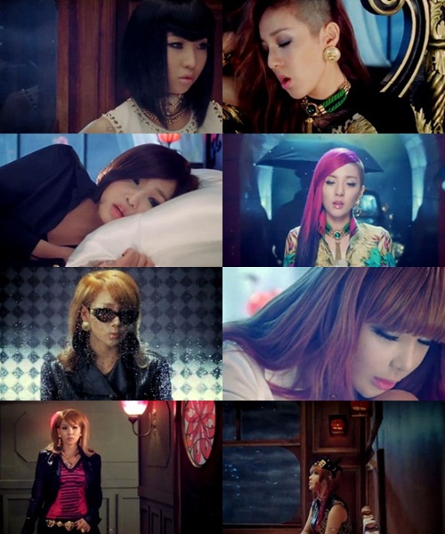 The biggest transformation was member Dara‘s, as she shaved half of her head. Quite dramatic, but either way she’s rocking it. In the teaser, her hair is styled stylishly with her long waves dropped to one side as she’s seen sitting on a sofa, which is was a pretty sight. In the MV she’s also seen wearing a bright pink wig along with blue/green ends creating a sort of ”ombre” effect which also is quite feminine.