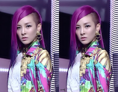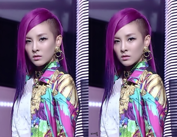 On the 15th, 2NE1 performed their newest single, “I Love You” on the stage of SBS music program, Inkigayo. During this day’s stage, Sandara Park’s vividly purple hairstyle, stood out and was a strong eye catcher.
