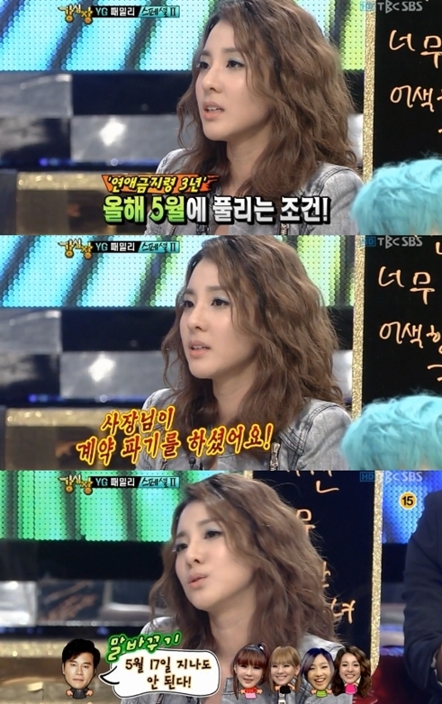 On the show, she shared, "Me and Park Bom's 3 year dating ban is scheduled to be lifted this May 17 and I was having my hopes up on it being lifted, but Yang Hyun president decided to change his mind and It will not be lifted after all". She continued, "I was really excited cause I was hoping I could start dating again but It suddenly cannot happen".