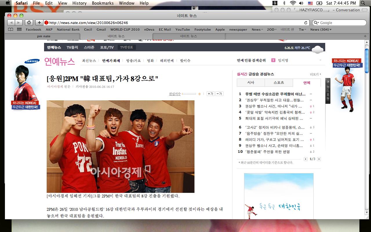 2PM은 26일 '2010 남아공월드컵' 16강 대한민국과 우루과이의 경기에서 선전할 것이라는 예상을 내놓으며 한국 대표팀을 응원했다.
