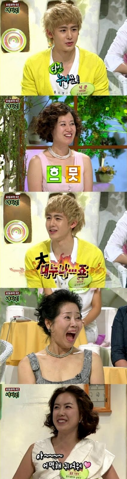 MC Lee Hui Jae pointed out that the two of them were twelve years apart [T/N: literally means the same zodiac animal which means they are twelve years apart], but Nickhun said “Not as far as aunt, but noona” and established a title for her. Then Park Mi Sun and Sun Woo Yong discussed whether they were noonas or aunts, then Nickhun called them, “Park Mi Sun noona, Sun Woo Yong big noona” causing laughter.